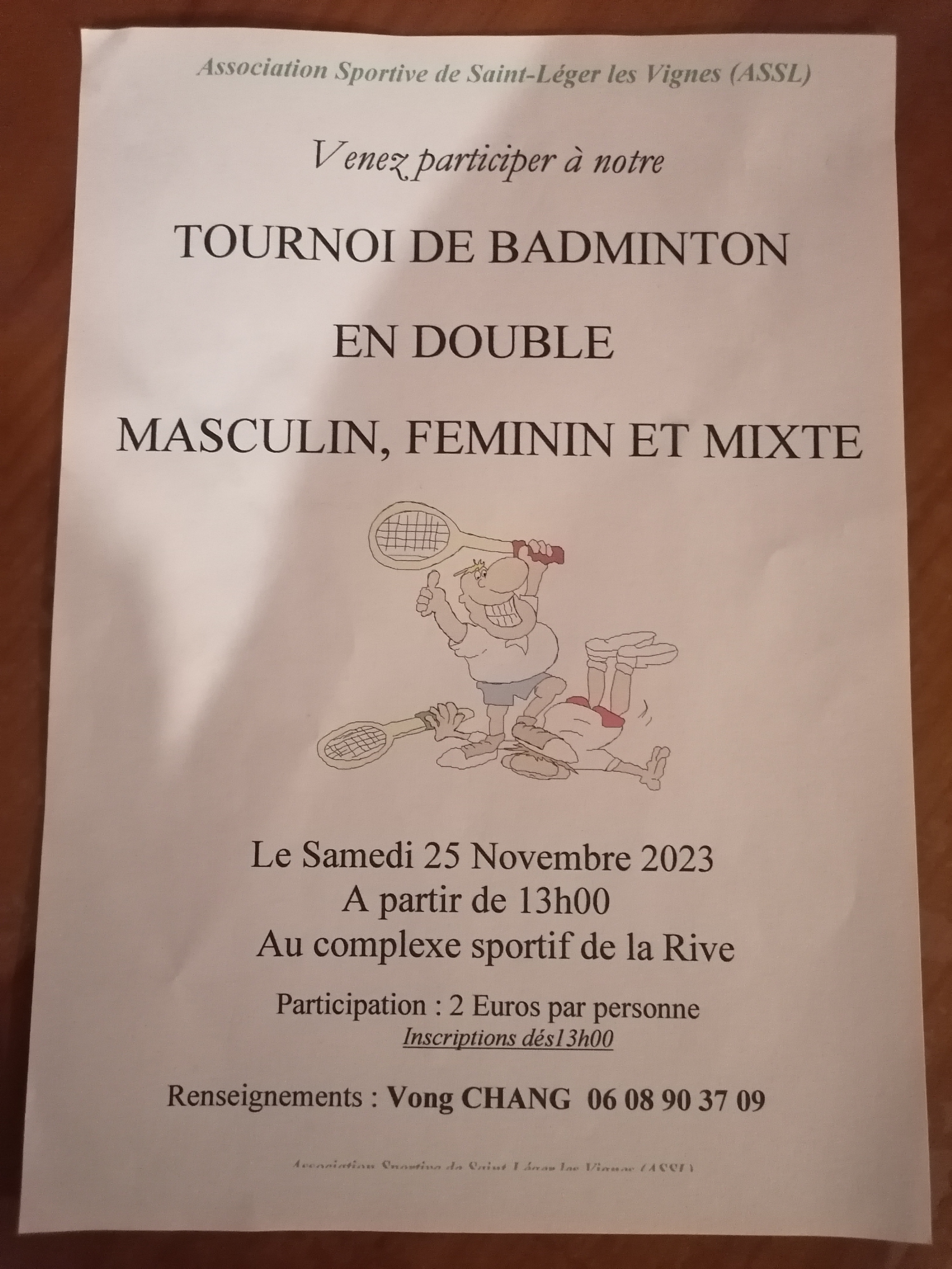 Venez nombreux à la salle de sport de Saint léger les Vignes le 25 novembre 2023 pour le tournoi de badminton !